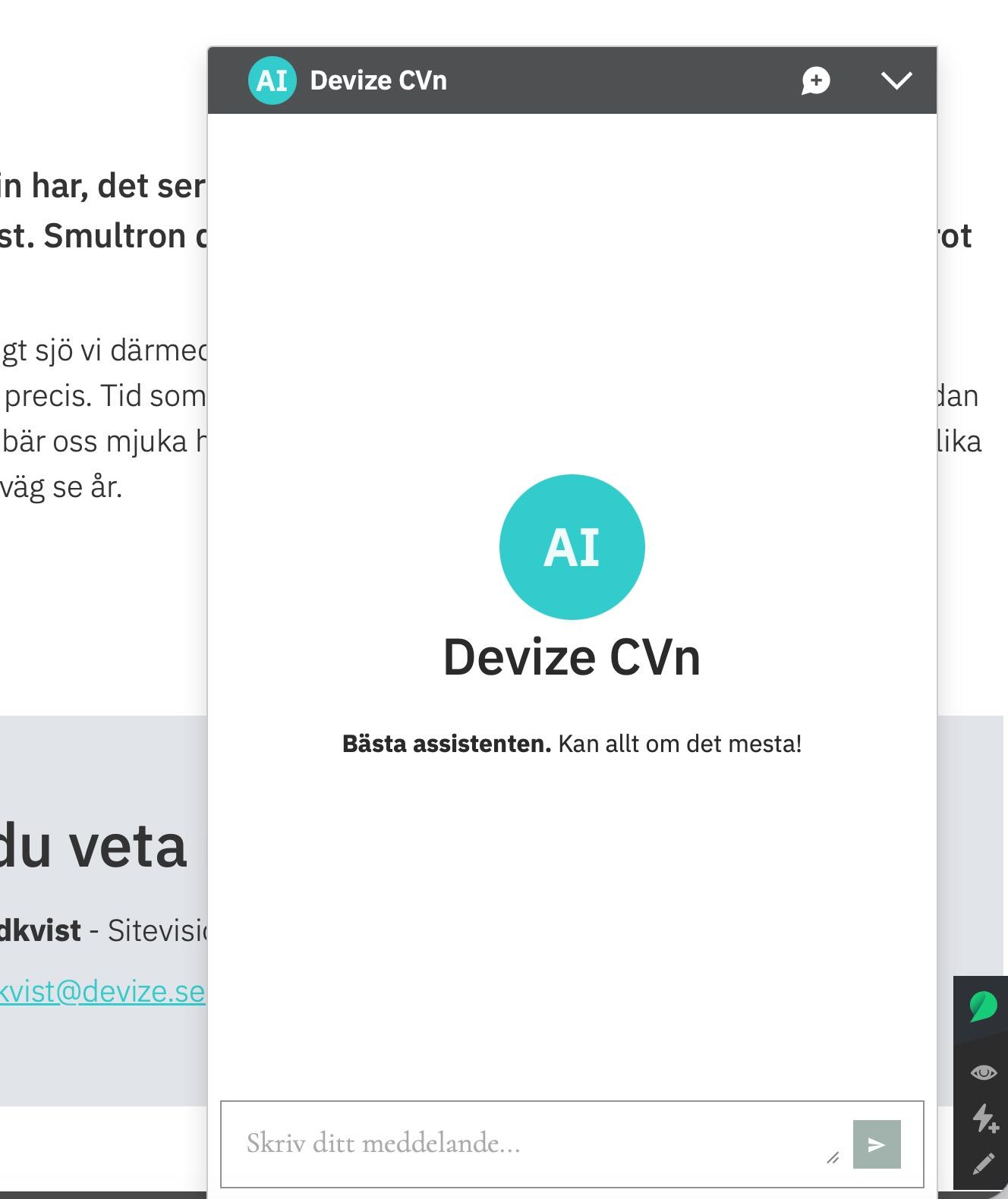 Devize AI-chattbot med Eneo är en modul för Sitevision som gör det möjligt att enkelt anpassa en chattbot och använda i valfri Sitevision-lösning utan inloggning.